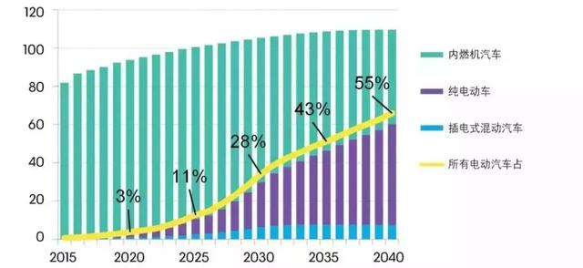 “到2040年,預(yù)計(jì)將售出約6000萬輛電動(dòng)車,相當(dāng)于全球輕型汽車市場(chǎng)的55%。”