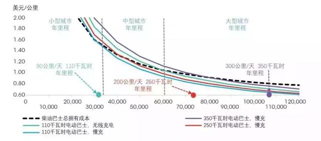 隨著每年行駛里程數(shù)的增加,電動(dòng)巴士的總擁有成本顯著降低,面對(duì)柴油巴士的優(yōu)勢(shì)逐漸擴(kuò)大。例如,一輛裝配有110千瓦時(shí)電池的電動(dòng)巴士加上最昂貴的無線充電裝置,每年行駛約60000公里時(shí)(3.7萬英里),其總擁有成本與柴油巴士持平。