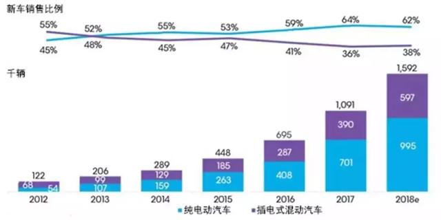 圖1為2012年至2018年全球不同類型乘用電動(dòng)汽車銷量及預(yù)測(cè)