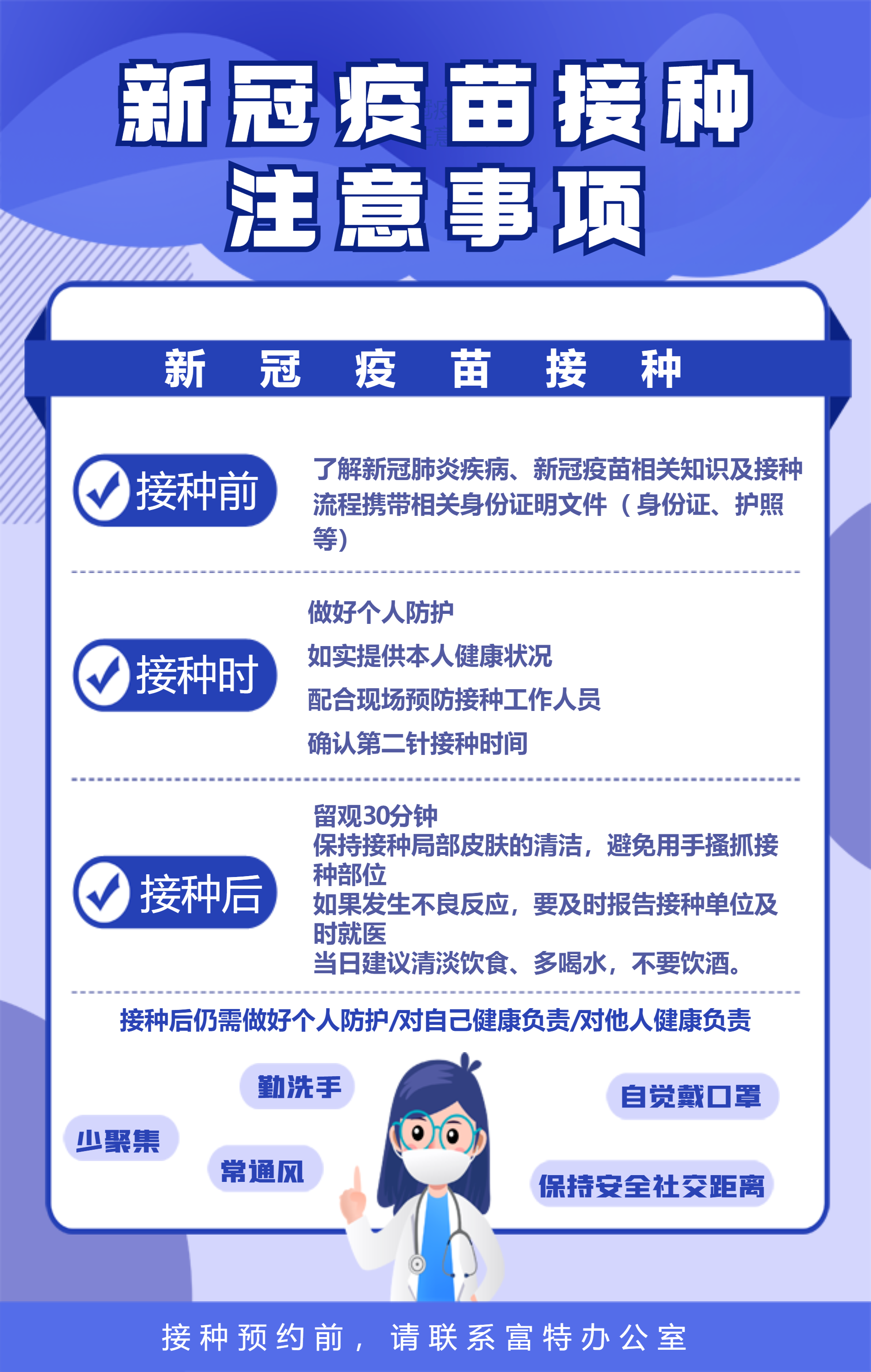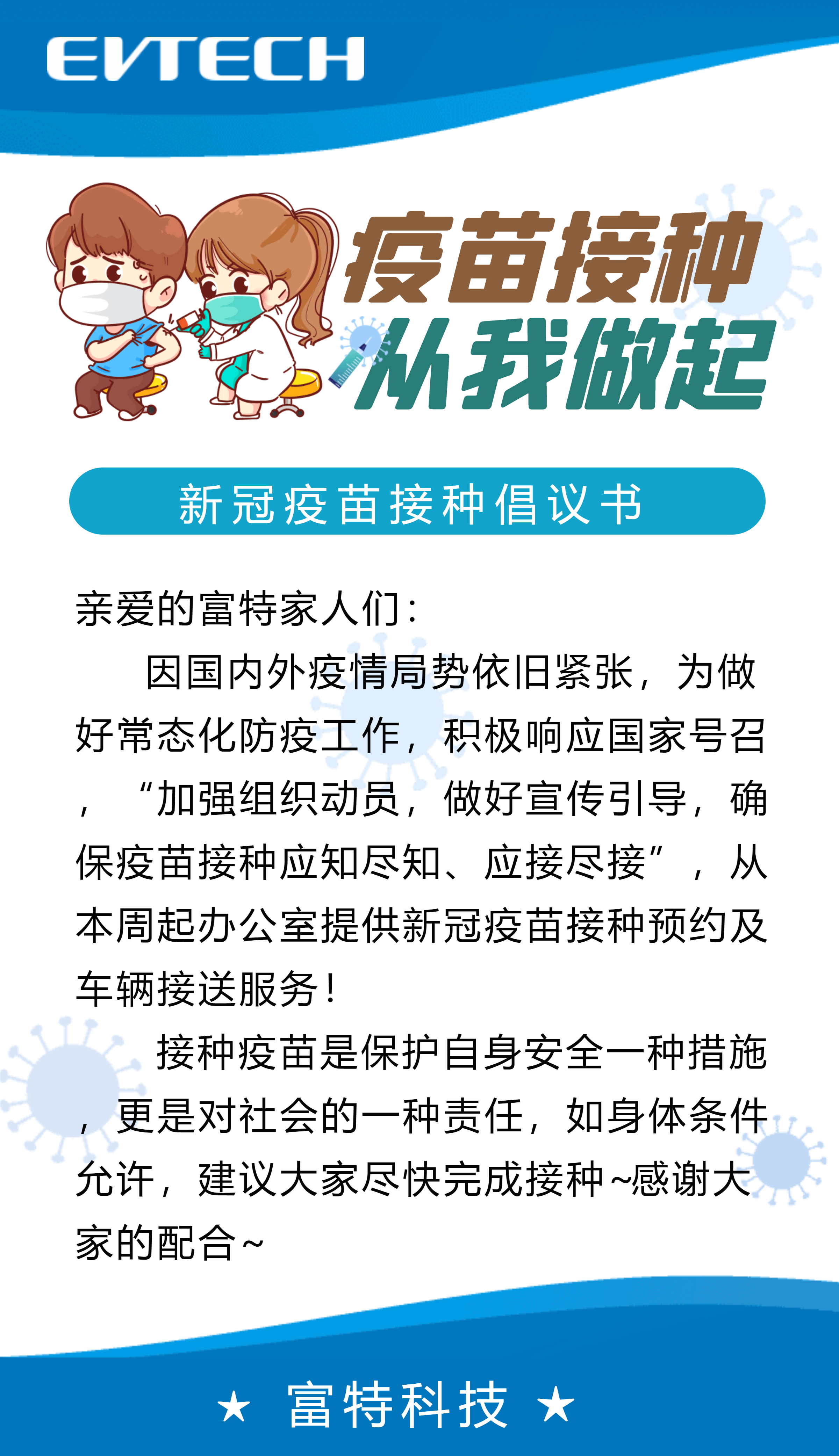 疫苗的接種預(yù)約及接送服務(wù),通過各部門內(nèi)勤伙伴統(tǒng)一提報(bào)給辦公室-徐雯即可,她將會(huì)大家做好相關(guān)事宜的安排!